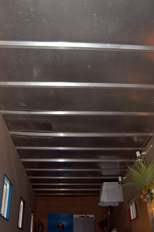 ![]() | コンテナを積み上げて何とか住めるようにはなったのですが、エアコンが効かない。 真夏はコンテナの外側が触れない程熱くなってしまいます。時々コンテナ全体に水をまいて冷却しないととても日中はいられない状態なのです。 それでも、夕方陽が落ちるとクーラーが効きはじめ、やっと世間並みの生活ができるようになります。 しかし、まいったのは冬です。12月、近くまで歯科医師会の懇親旅行できていたので、そっと宿を抜け出し一人でここに泊まったのです。 夜中あまりの寒さに眼が覚めました、酔っぱらって「てっきり外で寝てしまった」と思ったのです、しかし居るじゃありませんかコンテナの中に。 コンテナの天井はこの1枚のアルミ板だけなのです。エアコンの暖房は何の役にもたたず、朝までブルブル震えて過ごしたのです。 こりや〜あまりけちっていると、身のためにならんな〜と考えるようになりました。 これがきっかけとなって、外装と屋根葺きをプロに頼むことになりました。 本当のことを言うともう一つの動機があるのです、それは皆さんからの暖かい言葉でした。 何度、海の家の場所を説明しても、皆さん通り過ぎてしまうのです。 「てっきり、倉庫だと思ったので!」・・・・・・クソー。 |
