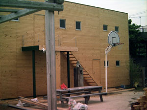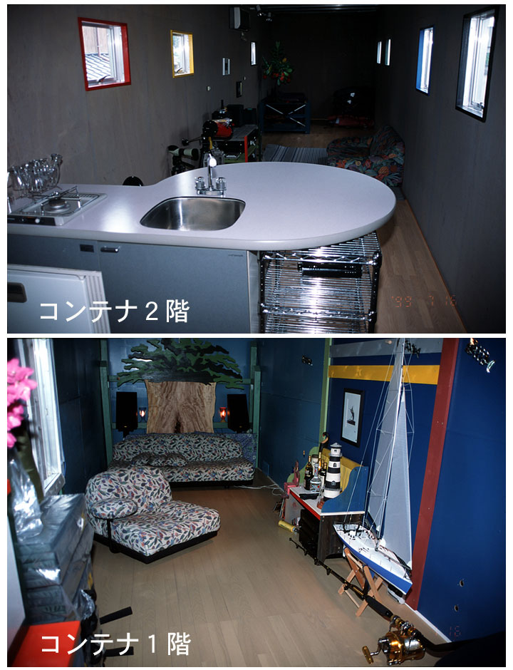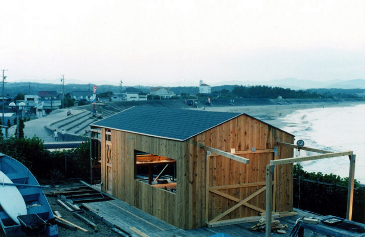 ![]() | 1996年2月からコンテナの外装工事が始まりました。外装をアルミにするか木にするかちょっと迷いましたが、木でやることに決定、ほぼ出来上った状態がこの写真です。 この頃は、記録を残しておくという意識が全くなかったためこんな写真しかありませんが雰囲気は分かっていただけるでしょう。 さすがプロ見事なものです、現場監督が板張りのレベルを出すのに大変苦労したそうです。それと海からの風がとにかく寒くて「固まってくるに」と話していました。 コンテナと外装の間に断熱材を入れたことで、エアコンの効きが抜群に良くなりました。 艇庫に使っていた1階部分もドアと窓をつけてもらい、自分たちで内装をしながら部屋に改造することになりました。 右隅にちょっと写っている材木の山を見て下さい。5月の連休が風呂建築の「地獄の労働」になっていくのです。 |