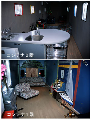 ![]() | 1999年のコンテナの中の様子です。ベッドはもちろん寝具などといった洒落たものはありません。 ホームセンターで買ってきた寝袋(980円〜3500円まで)が15枚程置いてあるので、眠くなった人はそれを1枚ずつもって適当な場所で寝ることになります。 2階の細長いコンテナに川の字になって寝ると10人以上が寝られます。奥の人はトイレに行く時に寝ている人を踏まないように行かなければならないので大変です。 今まで29人が同時に泊まったことがあります、今までの新記録、さすがにこの時は部屋から溢れた人がいて、車の中で寝た人もいました。 私も溢れて外のデッキで寝てしまいました、朝起きてから「顔に付いた木の模様」が暫くとれなかった・・・・・ |