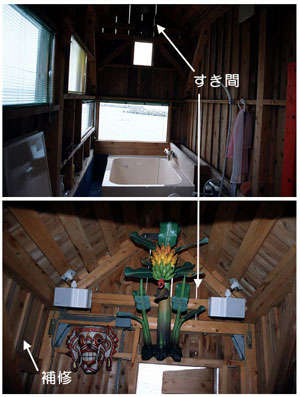 、だけどすぐ下にはサイクリング道路が走っている、たぶんしっかり見られた人がいるだろうと思っています。 ところが時間の経過とともに木が乾いて外装にすき間が空いてきたのです。ある時外から眺めていたら、お風呂が針千本みたいに外に向かって放射線状に光を放っているのです、・・・・・・・・実にかっこよかった。 しかし、女性陣が嫌がりましたすき間から見られてしまうのではないかといった恐怖心を抱いたからです・・・・・・・・・・・・・別にいいのに・・・。 そのために補修工事をしました、5cm幅の木を外装のすき間に貼っていきました、すき間の残ったところは高さから大丈夫だと判断したところです。 お風呂にも単独にCDプレーヤーが設置してあります、お風呂に入りながら美空ひばりやちあきなおみを聞く、最高!。 |