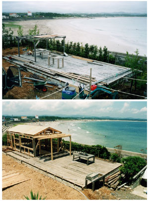 ![]() | いよいよ、食堂の建築が始ったのですが、写真の記録が全く無いのです。「夜明けから日没まで」の強制労働で全くそんな余裕がなかったからです。 そうしたら、1人だけ写真を撮ってくれていた人がいました。電気工事をお願いしていた半田の電気屋さんです、この写真はその人からいただいたものです。 1995年に作ったデッキとルーフ(上の写真)はそのまま使用して作りはじめた様子がわかります、下の写真の柱の色が古いところが前のものを使用したところです。 この時デッキを写真の左側に3mほどのばして食堂を建築し右側のオープンスペースをできるだけ確保しようとした記憶があります。 例によって手描きの簡単な図面をたよりに、ほとんどが現場あわせでつくってきたわけですが、今回はいくつかのアルミサッシや大形のドア−などがあり、風呂建築よりいくらか工夫が必要になったところがありました。 とにかく、1人での作業は効率が悪い、屋根に上がって板を打ち付けようとしたら寸法を間違えた、下へおりて寸法を直して上へ上がり、さ〜打ち付けようとするとコンセントが抜けている、又下へ降りる、そんなことの繰り返しでした。 しかし、真夏の炎天下の作業は辛かった、頭の中が「ウニ」になる、そんな感じでした。時に、余りの熱さに工具だけ置いてそのまま海の中にふらふらと入っていくのです。 そして身体からジューと音が出た夢遊病者はしばらく死んだように海に浮いているのであります。 |