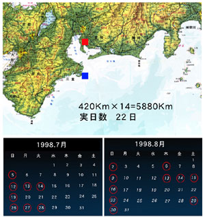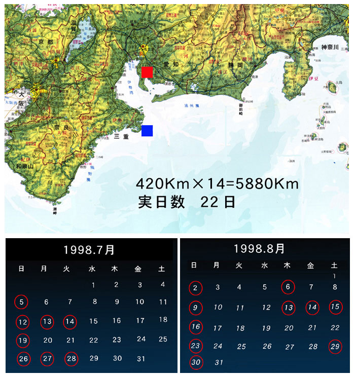 ![]() | 私の自宅は半田市にあります(赤い四角)、そして海の家は三重県甲賀にあります(青い四角)、両者の距離は片道210kmあります。 食堂建築にかかった日数は22日間でしたが、まとまって作業ができた時もありましたから、実際には14往復しただけですみました。 食堂建築のために移動した距離は420km×14=5880kmになります、夢中でしたから気になりませんでしたが、よく走ったものです。 1998年の7月と8月の休みはほぼ全て食堂建築のために費やしました(赤丸)、歯科医師会の役員をやっていなかった時なのでこれが可能だったわけで、今ではとても考えられないことです。 たとえば、7月の4日(土曜日)は仕事がPM5時半頃に終わるとすぐ車で出かけます、約2時間ちょっとかかりますので、順調にいってもPM8〜PM8時半くらいになってしまいます。この日は翌日にそなえて早く寝るようにするのですが、興奮して寝つけないことが多いのです。 翌日はAM5時には起き出して作業を始めます、昼は切りのいいところまで作業して外食に出ます、帰ってくるとすぐ作業を開始して5時くらいまでに作業を終えるのですが、道具類のかたずけに1時間以上かかりますので終わるのはだいたい6時頃になってしまいます。それからシャワーに入って車で210km走って自宅に帰るのです。 作業が長引いた時は、疲労困ぱいでへたり込んでしまうことがたびたびありました。その時は泊まってしまい月曜日の朝5時に海の家を出ます、自宅に7時過ぎ(まだ寝ている・・・)に着きますので、それからシャワーと食事をとって仕事に出かけていくのです。 |