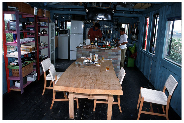 ![]() | 出来上った食堂の内部の写真です。皆でよってたかって料理したり食べたりできるようにレイアウトを考えました。 2人のむさ苦しい男が料理しているのはアイランドキッチンですバーナーは3つあり、本格的なオーブンもついておりなかなかのものです。 この中には7〜8人しか快適にいられませんが、大きなドア−を開けると外のデッキと一体となり15人前後までは快適に食事ができます。 しかし道具はそろっていますが、まともな料理などできるはずもなく、素材をそのまま活かした料理に徹することにしています。 幸い魚介類は特上のものが市場の半額くらいで手に入るのでそれを使った料理になります。 下手に手をかけると不味くなってしまうことが多いので、男の料理としてはかえって好都合かな・・・・・ちょっと寂しいけれど。 ふだん家で料理などしたことのない男どもが、ここでは不思議とよく動きます、飲みながらでも誰かが何かをしている。リピーターの中には料理の腕をあげてくるやつも出てくるようになりました。 「動物は食べるために生きてる」そんな実感が湧いてくる食堂になるといいな〜 ブッシュマン:お金ないから働かない、働かないからストレスない・・・・ |