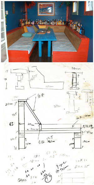 ![]() | 食堂は結局全く図面を書くこと無く出来上ってしまいました。「ここに柱を1本増やそーっと」「ここにも1本増やした方が・・・・」とやっているうちに出来上ってしまったからです。 しかし、アイランドキッチンのレンガ積みあたりから設計図らしきものを書かないと材料の調達が出来なくなってきました。 アイランドキッチンの図面と一緒にバーコーナーの図面もでてきたので紹介します。 夏の熱さに当たったのでしょう、懲りずに食堂と一緒にコンテナの1階にバーも造っていたのです。 この頃になると定規をつかって簡単な図面を書くようになりました、ちょっとややこしくなると図面がないと結局うまくいかないことを学習してきたからです。 それにここはよく目に着くところなので、さすがに好きなバラック仕様というわけにはいかず、図面を書いて仕上がりのきれいなものにしたいと見栄をはった!。 背もたれが斜になっているところの角度調整が大変でした、なんせ奥の両コーナーは斜と斜がぶつかるので角度が出せないのです、図面ではどうしても角度が出せないため、またまた得意の原物合わせでなんとか格好をつけた。 ここで一日中ぐだぐだ酒を飲んでいたら楽しいだろう〜と考えてバーを造ったのだけれど、どーもイメジーが違うんです。 すぐ、お酒を持って食堂か外に出てしまうのです。海の家に行った時ぐらい開放感に包まれてお酒が飲みたいと感性が受つけてくれないようなのです。 「スナックで飲んでいるようで楽しい」と喜んだのは子供たちだけでした・・・・・・ウーン寂しい。 |