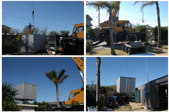 ![]() | バイクや6輪車の車庫にしようと購入してあった冷蔵コンテナです(左上)。バイクの出し入れも便利だし暫くここにと置いたはいいのだが、夏にアメリカデイゴがきれいに咲いてもコンテナの陰に隠れて良く見えないし、アルミの頑丈なコンテナは「ぼろぼろのバラック建築」にはいかにも馴染まない。 いろいろ考えた末、食堂うらの見晴し台の位置に移動することに決定。20トンクレーンを頼んで実行することになりました 。当日来たクレーン(右上)はバカデカイもの、でも私は内心心配してた「ひょっとして駄目かも・・・距離がありすぎる」と。 作業が始まった当初は順調でした(左下)、徐々にアームをのばして行く(右下)もう一寸で所定の位置というのにクレ―ンのブザーが鳴りはじめた、オペレータが「後ろがふあふあ持ち上がりはじめた!、前のめりになるとコントロールできなくなるので絶対コンテナの下に足や手を入れないで」とガムをクチャクチャやりなから平気な顔で作業している。私たち・・・コンテナがドスンと落ちる、そしてクレンのアームが頭の上におちてくる・・・・恐い・・痛そう・・・無言の作業が続くのです。 |