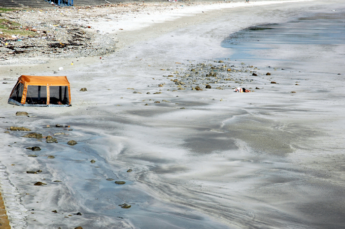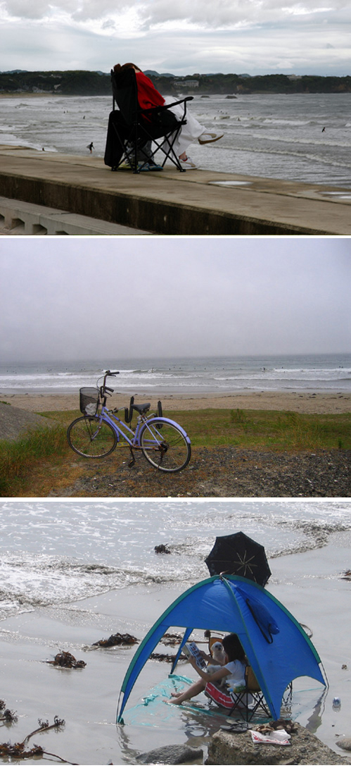 ![]() | 朝5時に起きてしまうと、何もやることが無い、そんな時はそーとバイクを引っ張り出し、ゲストを起こさない様に少し離れたところでエンジンをかけ、海岸を走り回るのです。 サイクリングロードをノーヘルで走るのはホント気持ちいい、風になったようだ。 前にもお話ししたように、ここのサイクリングロード沿いの海岸はサーフィンのメッカなのです。 ノーヘルの初老のライダーは素敵な風景に出会うとひょろけながらターンをして、急いでカメラを取りに帰るのです、そして「おぬし中々やるな!」と独り言をいいながら写真を撮るのです。 上:夜通し走ってきて疲れてしまったのでしょう、すっかり寝込んでしまっています、彼は夢中でサーフィンをしているのでしょう、暫くこんな風景が続いていました。 彼女のスニーカーのはき方のセンスのいいこと!、もうちょっとと思ったけれど変態と思われないように,早々と退散したのを覚えています。 中:自分で改造したのでしょうママチャリにボードキャリーが取り付けてあります、右側のボードキャリーにボードを乗せて私たちの海の家の横をふらりふらりと走って行くナイスガイを見たことがあります。 海岸にぽつーんとおかれた自転車から、子供の頃からのやり残した夢が走馬灯の様に浮かんでは消えていきました。 下:時々お尻の下ぎりぎりまで波がきています、流されるのではないかと心配しましたがこの人たちは今が満潮なのを知っているようです。 悠々と読書をしている横で落ち着かない犬がきょろきょろしている、岩の上に3人分の履物がおいてある、他の二人は今夢中でサーフィンなのでしょう。 |