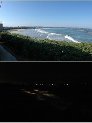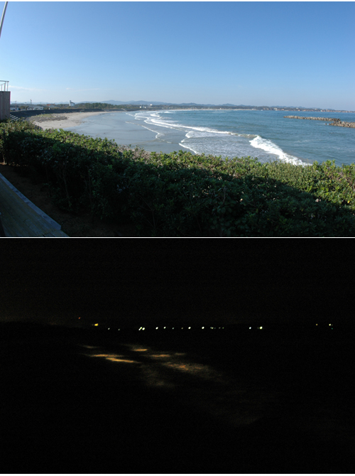 ![]() | 10月も半ば、さすがに海水浴客が来なくなりました、人の少ないのんびりした海辺が戻ってきています。結構気に入っている、冬の「誰もいない海」までもうちょっとです。 海の家に夜着くと、外からざーざーと音がするので海らしい事はわかっても,月明かりの無い夜など真っ暗で何も見えない、「本当に海?」などと素朴な質問が出る事になります。 むかし(10年も前のこと)、タヒチのレストランで真っ暗な夜の海に波がしらだけが白く輝いていたのです、そのあまりのきれいさに暫く見とれていました。どうしてこんな不思議な光景になるのだろうと見回してみると、海に向かってライテイングをしていたのです。 「お主なかなかやるな!」あの光景が私の脳裏からず―と離れないでいました。 見晴し台の8020に目を付けて夜の海をライテイングしようとしたのはそんな訳なのです。 さて昨晩(17日)は台風の影響で好い波が入って来ました、さっそくライテイングをしてみました。 真っ暗な海に波だけが白く浮き上がり、なかなか幻想的な光景になりました。 |